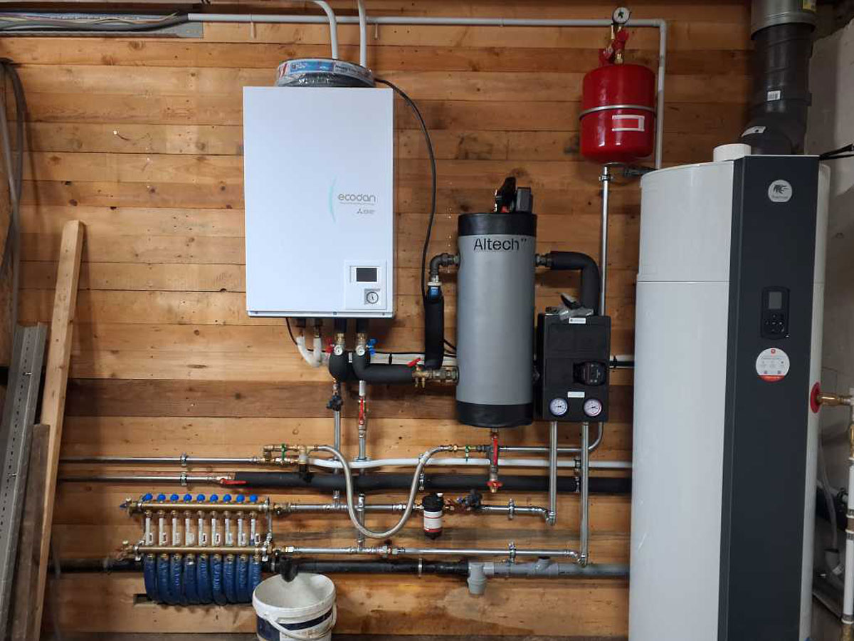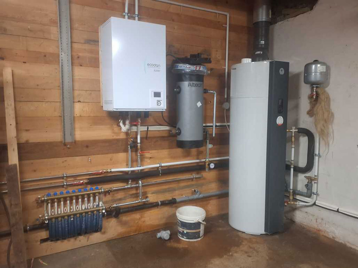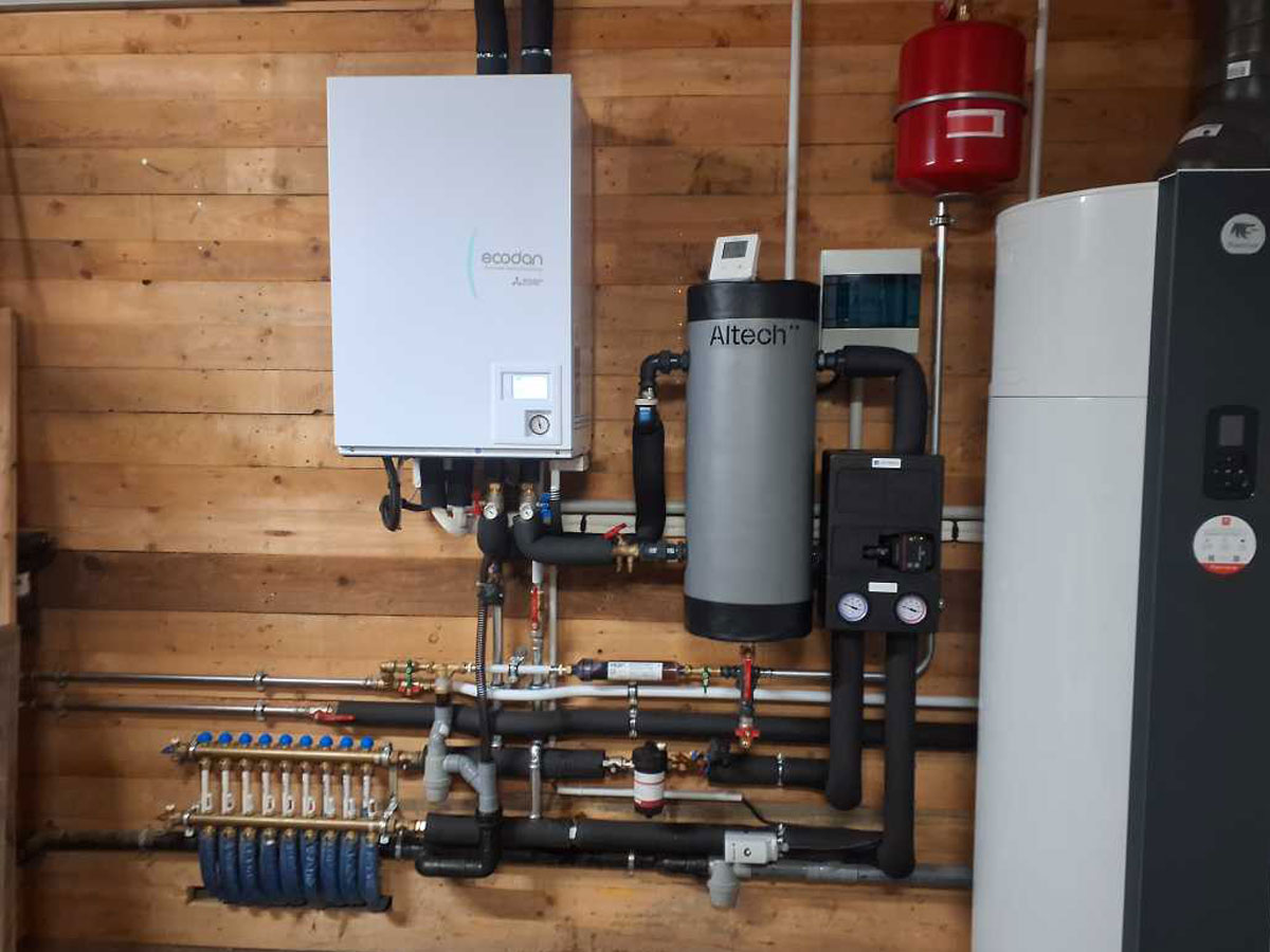 Type d’intervention : Remplacement d’une chaudière fioul basse température par une pompe à chaleur avec ballon thermodynamique dans un corps de ferme.